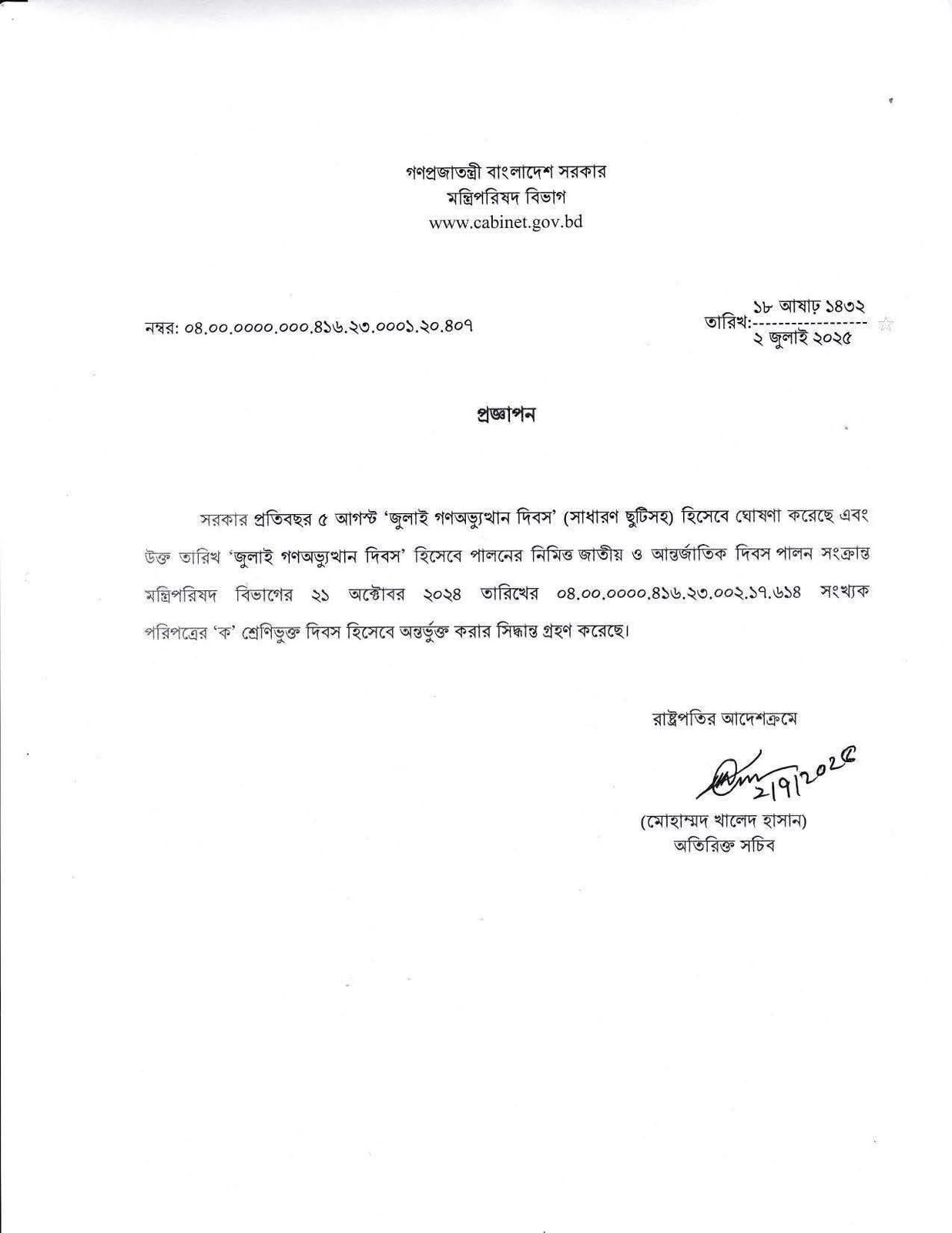 এতদ্বারা অত্র বিদ্যালয়ের সকলকে জানানো যাচ্ছে যে, আগামী ০৫/০৮/২০২৫ খ্রি: তারিখ রোজ মঙ্গল বার “জুলাই গণঅভ্যুত্থান দিবস” (সাধারণ ছুটি) হিসেবে ঘোষণা করেছে বিধায় অত্র শিক্ষা প্রতিষ্ঠান ছুটি থাকবে। আগামী ০৬/০৮/২০২৫ খ্রি: তারিখ যথা নিয়মে শ্রেণি কার্যক্রম সহ সকল কার্যক্রম চালু থাকবে।